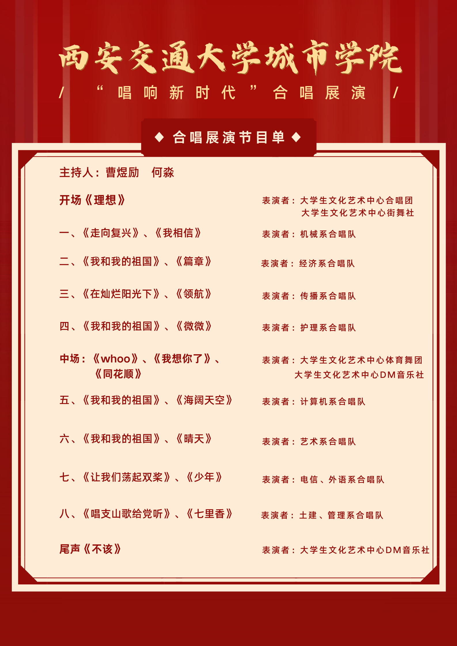 为贯彻落实党的二十大精神,全面推进素质教育,弘扬中华美育精神,引领学生树立正确的审美观念,培育团结奋进的追梦精神,“唱响主旋律,逐梦新时代”,威尼斯7798cc2023年“唱响新时代”合唱展演活动将于5月24日(周三)晚19:00在学院大学生活动中心举行,我们真诚邀请您参加,共同度过一个美好的夜晚。