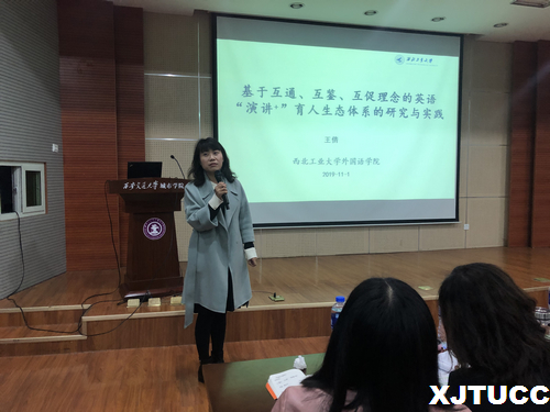 报告会中,王倩副教授从英语教学中遇到的实际问题如课时缩减、第二课堂辐射面不广、学生学习动机弱且英语学习四年中前后断线、学生语言能力难以实现可持续性发展等现状出发,分享了西北工业大学英语课程教改团队通过构建“以学生为中心,理念与实训相结合”,实现“四位一体”即“二语语言素质+文化素养+思辨能力+实际应用”的“演讲+”人才培养模式。依托“英语演讲与思辨”课程,以学生为主体,教师为主导,建立生态化的师生和谐关系;注重学生学习过程性管理,创建了多元化的学生评价体系;强调互赢互利,打造师生共同学习体;以合作为导向,促进优质资源生态流动。整场报告会信息量大,内容丰富,让外语系教师和学生受益匪浅。报告会后部分教师与王老师就如何结合第二课堂和开设选修课引导学生的英语学习兴趣并实现有效语言学习进行了深入讨论。