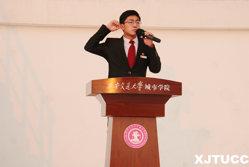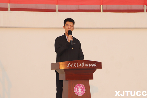 升旗礼毕,2019级新生代表传播系路凡同学发言。他以“追寻理想,共筑中国梦”为题,表达了对新中国成立70年来取得翻天覆地的变化的由衷赞叹。作为新时代的青年学子,他倡议,青年要成为有理想、肯奋斗、愿担当的人,共同为祖国能够全面建成社会主义强国而努力,创造新的世界辉煌。随后,团委组织部常务副部长杨虎祥同学带领全体共青团员重温入团誓词。不忘初心,牢记使命,现场共青团员共同为新中国成立70周年送上祝福,并与大家一起唱响中国共产主义青年团团歌《光荣啊!中国共青团》。最后,由学生服务中心主任张学堂老师总结讲话,他讲到,2019年是我们党和国家历史上具有特殊重要意义的一年,是决胜全面建成小康社会第一个百年奋斗目标的关键之年。作为社会主义事业的建设者和接班人,身为新时代中国青年的青年,一定要传承中华民族优良光荣传统,立足实践、努力学习、增长知识、锤炼品格、心怀祖国、心系人民,只有青年不懈奋斗,才有祖国未来日益强大、繁荣和富强。