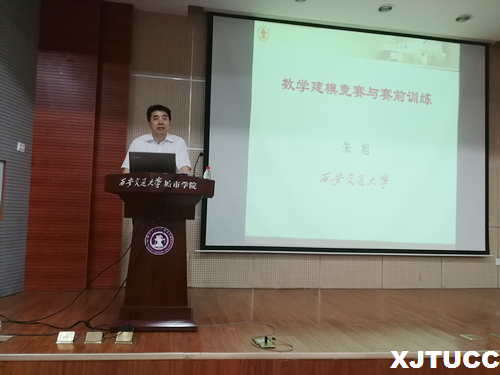 数学教学部主任朱旭做了关于数学建模竞赛的报告。他首先强调了参加数学建模竞赛的重要性。通过讲述西安交通大学优秀数学建模参赛学生的经历,鼓励我院学生积极参加竞赛,应对挑战。通过参加数学建模竞赛,努力提升自己、挑战自己、展示自己。他指出作为一名参赛者,关键在于学,建模的过程即是一个学习提高的过程,鼓励学生一定不要放弃这样一个难得的学习机会。
