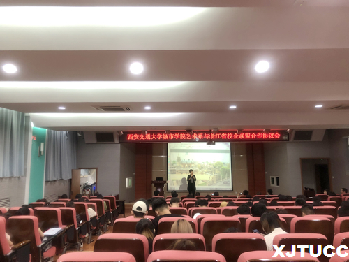 会议伊始,由浙江易启莱校企联盟执行秘书长方小英女士向同学们详细介绍了校企合作项目与现代经济下企业对大学生专业学习程度的要求。易启莱校企联盟联盟企业代表张亚玲副总对学生提出的考证、面试、就业等与学生切身利益相关的问题,现场进行了详细的解答与指导。易启莱校企联盟主席陈浩博导鼓励同学们在今后的道路上勤于思考,找准人生定位,坚定理想信念。随后,浙江省综合性大学美术学院设计学院院长联盟主席、易启莱校企联盟主席陈浩博导与艺术系主任解安宁教授进行了校企联盟合作签约,西安交大威尼斯7798cc艺术系与浙江省校企联盟达成协议以建立长久的合作关系。最后,艺术系主任解安宁教授对本次会议进行总结讲话,解老师期望同学们在离开校园走向社会之际,能树立远大目标,相信自己,不忘初心,砥砺前行。