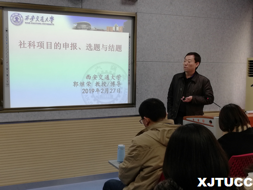 随后,外语系主任郭继荣教授给教师们作了“社科项目的申报、选题与结题”的学术讲座。郭老师结合他自己的研究历程、课题申报的实践和项目评审的经历,运用大量的案例,从项目选题、研究内容撰写、研究方法选择、研究问题设计等方面,深刻剖析社科课题申报的要点、常见问题和技术线路等,并给大家提供了切实可行的项目申报选题建议。他希望全系教师能以追赶超越的精神,结合教学实践,以道驭术,勤奋工作,积极开展科研学术工作,争取在新的一年里取得教学和科研双丰收。
