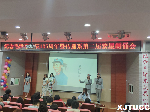 12月26日是毛泽东诞辰125周年,为了纪念毛泽东,同时拓展学科专业的课外实践,丰富内涵式教育的形式内容,西安交通大学大学威尼斯7798cc传播系于12月12日在F100举办了纪念毛泽东125周年暨第二届“繁星”朗诵会。传播系系主任张蓉、学生工作主管陈杜昊、传播系教师徐阳、李灿、孙涵忆、辅导员田园园以及传播系2018级学生参加了本次朗诵会。