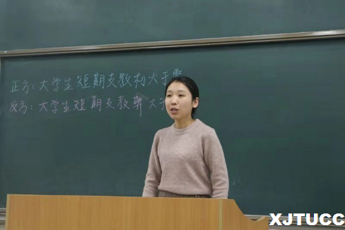 本次比赛在主持人宣读评分细则,双方选手进行自我介绍后正式开始。双方就“大学生支教利大于弊还是弊大于利”的观点展开辩论。双方辩手在立论、驳立论、智辩等各个环节中表现出来的清晰的思路和巧妙的陈词,给观众留下了深刻印象。比赛尾声,弈术辩论文化协会李俊竹对本次比赛做了详细的点评,随后主持人宣布比赛结果,由韩潇潇老师为他们颁奖并发表了总结讲话。