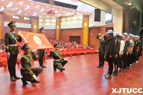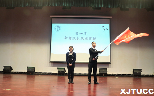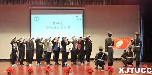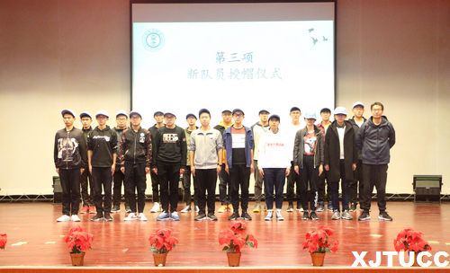 迎团旗,奏团歌,本次入队仪式在嘹亮的团歌声中拉开帷幕。首先,向日葵上一届队长郭泽莹将继承着使命的队旗交到了新队长贾甲申的手里并由副队长苏桐玉宣读新队员名单。随后,院团委丁义伟老师为新队员授帽,并由副队长带领全体队员齐声宣誓。之后,机械工程系团学工作负责人韩潇潇老师宣读了上届优秀队员名单,并为其颁发了证书。