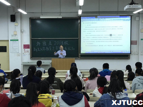 9月20日下午,外语系于A100举办2018年外语系新生入学教育。本次讲座由外语系副主任赵永生副教授主讲,外语系2018级全体新生参加。“大学之道,在明明德”,座谈会伊始,赵永生老师就“大学”“教育”的本质对同学们进行了深刻的阐释,并用亲身经历讲解了大学生知识的建构内涵,指出当代大学生要具有思考、评判、以及探究的能力。他指出,大学教育的目的在于先成才,再成人,而后学为好人。“内化于心,外化于行”,赵老师对2018级新生讲述了学校优势并进而启发学生不断认识自身的优势,鼓励学生们树立远大的理想。“积极主动,勇于承担”,赵永生老师强调了理想于大学、于人生的意义,告诫学生“心中要有理想,做事要有方法”,在大学这四年里,要为自己美好的理想奋斗。抓住一切可以锻炼自己的机会,努力提升自我能力。