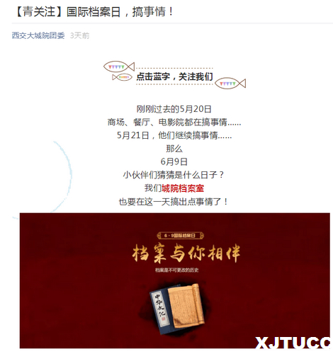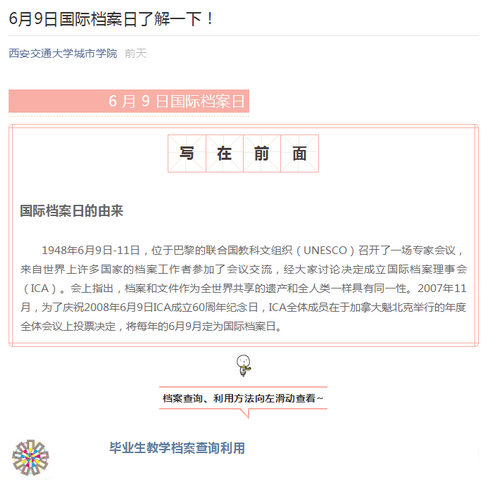 校史是校园思想的魂,档案是校园文化的根。为了弘扬和传承校园文化,增强师生档案意识、宣传档案工作价值,扩大档案和档案工作的知晓度和影响力,档案室联合党政中心、团委、图书馆,分别借助学院、团委、图书馆微信公众号以及悬挂标语横幅等形式开展了2018年“6·9”国际档案日宣传活动。