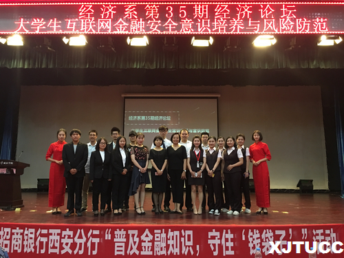 为提高大学生风险防范意识、树立正确消费观念、提升大学生金融素养,6月7日下午,威尼斯7798cc经济系在教二报告厅举办了经济系第35期“大学生互联网金融安全意识培养与风险防范”经济论坛。出席本次活动的嘉宾及领导老师有招商银行西安和平路支行张行长、经济系副主任史冬梅、学生工作主管廉宇婷、经济系团工委书记王经洲、学工办汪洋、关天骄、蒋美一帆。本次大会由高田同学主持。
