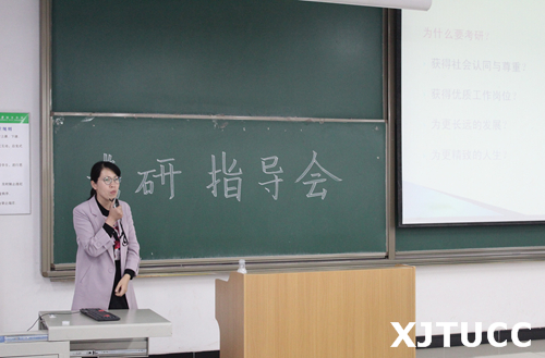 会议伊始,解茹玉老师向大家介绍了考研的基本要求和具体内容,与大家分享了往届考研录取信息。解老师通过考研数据分析,从考研动机、备考准备、专业和导师选择、调剂注意事项四个方面进行深入讲解,并对考研公共课方面进行具体指导。