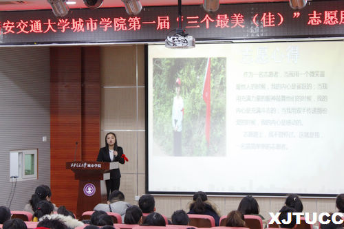 用心体会真情,用爱温暖人间。本次参加评选的10位优秀志愿者代表分别是:李俊竹、王娇娇、廖国涛、杨欢、李琳、林丹丹、姚峥、常睛晴、李鹏建、时晓阳。他们在城院的志愿服务活动中,充分践行志愿服务精神,发扬城院大学生的风采,而在今天的讲解中,选手们用精心制作的PPT,展示自己的志愿服务经历和体会,从自己的志愿服务历程到志愿服务成功,这其中有泪水也有欢笑,有的选手声音呜咽,眼眶随之湿润,随着选手的讲解,比赛达到了高潮。讲台下,评委老师和学生们静静的聆听一个个故事,被志愿服务的魅力深深吸引。