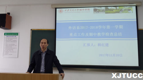 11月10下午,西安交大威尼斯7798cc外语系在教学楼B307教室召开了全系大会。外语系常务副主任韩红建副教授对2017-2018学年第一学期重点工作及期中教学检查工作进行了总结。会议由外语系副主任赵永生副教授主持。