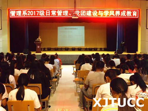为强化管理机制,加强学风班风的建设,帮助新生更快地适应大学生活,管理系于9月14日晚在大学生活动中心召开2017级新生日常管理、党团建设与学风养成教育活动。出席本次活动的嘉宾老师有管理系学生工作主管刘健,系团工委书记韩珺,李玉婷以及辅导员李辉、姚赞等老师。