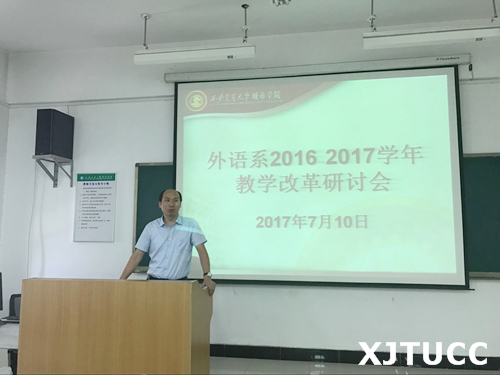 最后,外语系常务副主任韩红建副教授对各教研室下学年深化教学改革的思路和设想进行了逐一点评和总结发言。韩老师强调,在推动外语教学改革中,一定要理念和思想先行,要靠符合教学规律的科学理念和思想引领教学行为。在下一步的教学改革中,一定要按照“目标导向”和“问题导向”的思路,进行教学改革的顶层设计,把教学中存在的问题分解为一个个具体的教学目标和任务,并将每个目标和任务落实在具体的教学活动中,使教学问题的解决和目标的实现有载体、有手段。同时,他要求各教研室利用暑假时间进一步细化教学改革思路,尽快形成可执行的教学改革方案并在下学期开学启动实施。