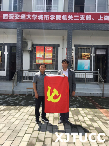 最后,张学堂主任向上湖滩村支部书记康志海赠与了党旗,两支部党员在党旗下合影留念。