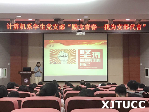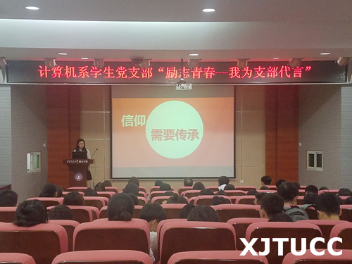 为更好地发挥党员先锋模范带头作用,传承大学生党员优秀品质,引导和带动更多青年学生向党组织靠拢,计算机系学生党支部于5月26日在F100举办“励志青春--我为支部代言”主题活动。计算机系主任缪相林教授、系学生工作主管兼系学生党支部书记刘敏涛老师及全系学生党员、入党积极分子、先进青年参加活动。