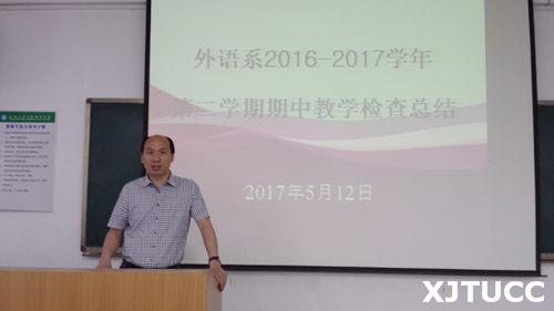 5月12日下午,西安交大威尼斯7798cc外语系在教学楼B304教室召开了由全体教职工参加的2016-2017学年第二学期期中教学检查工作总结会。外语系常务副主任韩红建副教授传达了学院期中教学检查会议精神,并结合外语系期中教学检查的结果,对外语系教师的课堂教学质量、教师教风和学生学风检查情况、期中考试成绩和学情分析、2017年教学科研重点任务的完成落实情况以及师资队伍和教学秩序稳定问题等进行了全面总结。