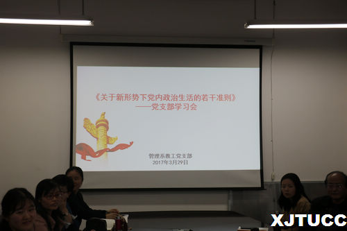 下午管理系教工党支部在2-225召开《关于新形势下党内政治生活的若干准则》的学习会,管理系主任卫民堂、管理系党总支书记冀祥、副主任郭关科以及全体党员同志参加了本次会议,会议由支部书记许玮玮主持。