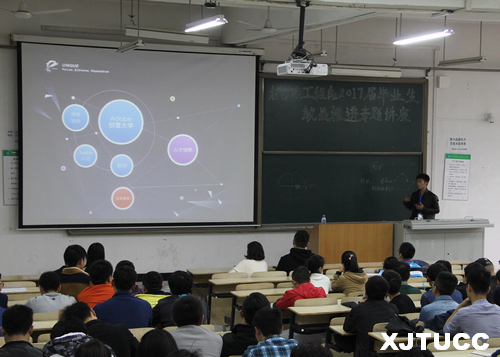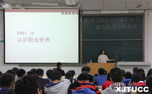 姚敏老师从认识职业世界、工作世界探索、国家职业分类三个方面对大学生就业作出指导。她分析了专业技术型人才在就业岗位上占有的绝对优势,并鼓励同学们加强专业知识的学习。优逸客张老师向同学们详细介绍了优逸客有限公司,他提到优逸客公司已经与机械工程系联合成立了“前端高薪就业班”,将为学生提供更多高薪的就业岗位。同时对“前端”做出详细介绍,使同学们对高新技术有了新的认识。
