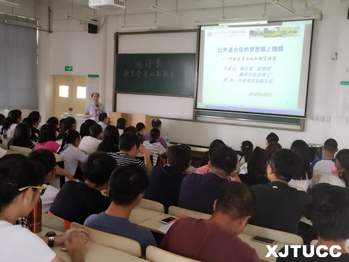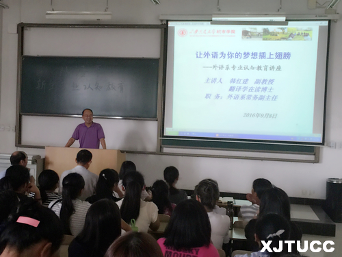 为了使新生尽快适应大学学习生活,了解外语专业学习基本情况,西安交大威尼斯7798cc外语系于9月8日下午四点在教学楼B400举办题为“让外语为你的梦想插上翅膀”专业认知教育讲座。讲座由系常务副主任韩红建副教授主讲,副主任赵永生副教授主持,新生班主任、辅导员和全体新生参加了本次讲座。
