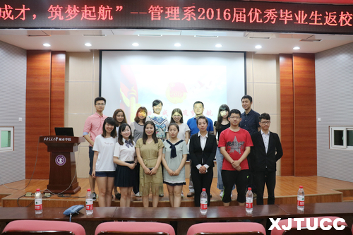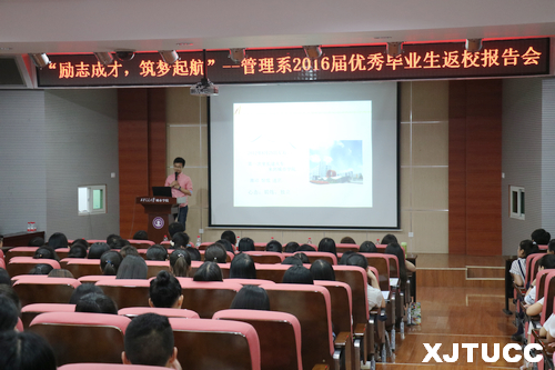 6月6日晚,管理系在F100举办了“励志成才,筑梦起航”优秀毕业生返校报告会,管理系冀祥、刘健、陈杜昊以及2012级学生辅导员参加活动。本次活动前期特别收集并制作了往届优秀毕业生的感恩视频,对低年级同学起到了较好的榜样作用。会上,2012届毕业生郭野和2013届毕业生王丹分别从工作、自主创业和考研方面与同学们进行了交流和分享,告诫学弟学妹们珍惜大好时光,做自己想做的事,不在大学留遗憾。2016年应届毕业生刘思彤和廖枭雄,分别也就自己的就业经历与公务员考试的切实经验进行了生动、务实的发言,在场同学都表示深受启发。会议最后,冀祥老师作总结讲话,他认为本次活动意义不仅是经验交流,更是成长成才的深切体会,并希望同学们对未来的就业充满信心,珍惜大学时光,充实自己、锻炼自己、完善自己。