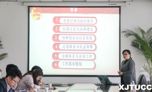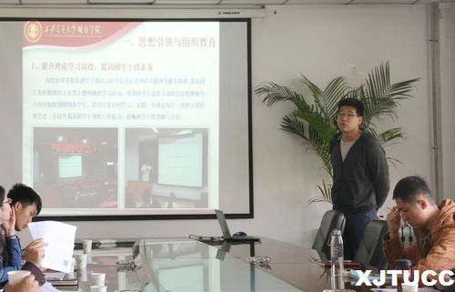 首先,各系团工委书记进行工作展示。外语与人文社科系团工委书记樊超,以"在思考中前行"开始,着重介绍了"外国语言文化论坛"、"金秋外语文化节系列外语教学活动"及"英文辩论队"三个主要特色活动。护理系团工委书记汪成鸿展示了本系"一系一品"第三届健康知识大赛以及护士节健康义诊活动成果,学生积极参与,获益良多。计算机系团工委书记于从聪将其团学工作理念总结为"一个中心、两个方面、三个能力",介绍了计算机系科技讲座、演讲比赛、团学交流会三个学术交流活动,同时展示计算机系一支筑梦支教队发展为陕西公益发展中心的卓越成果。随后,管理系团支部书记陈杜昊提出管理系通过"建档案、办讲座、勤指导、多培训"的方式促进学生创新创业。管理系多次跨系联合,通过学科优势互补促进各系共同提高,同时努力打造"轻娱乐、重品牌、增收获、促学风"的团学活动生态,促进学生全面发展。电信系团工委书记张天提出电信系"2+3+2"品牌模式,即电子"兴趣小组与mallab竞赛二创新、电信系历届优秀学子宣传册、榜样墙、信语飞翔三回顾,名师大讲堂、学生讲堂二交流",创新教学成效显著。机械系团工委书记杨耀聪展示了机械系组织学生参加"挑战杯"大学生创业计划竞赛,三支队伍参加"非凡士杯"均荣获得二等奖、第八届大学生节能减排大赛、我院星火杯以及首届机械系创新设计大赛等多项赛事并取得佳绩,同时对未来团学工作提出"五个加强,一个紧跟"的工作计划。经济系开展系列活动,如"头脑风暴--创新创业杯"学科竞赛活动、专业品牌"经济论坛、"奔跑吧,offer"模拟招聘大会,以及脑力品牌"一站到底"知识竞答挑战赛,经济系团工委书记提到在团学工作中她结合本系特点,设定独特的品牌活动以及品牌赛制,效果良好。