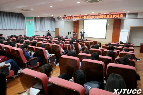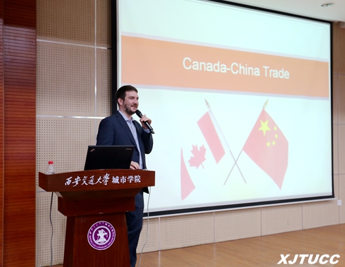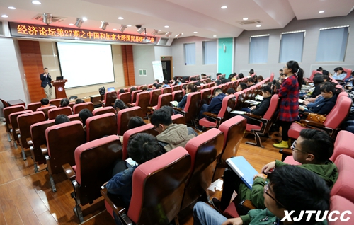Barber首先就中国和加拿大经济贸易状况进行了讲解,主要介绍了中国与加拿大之间的贸易往来方式、各国最主要的经济支柱产业结构以及资产的流动方式。报告结束后,Barber还进行了提问,同学们都积极回答问题,现场气氛十分活跃。