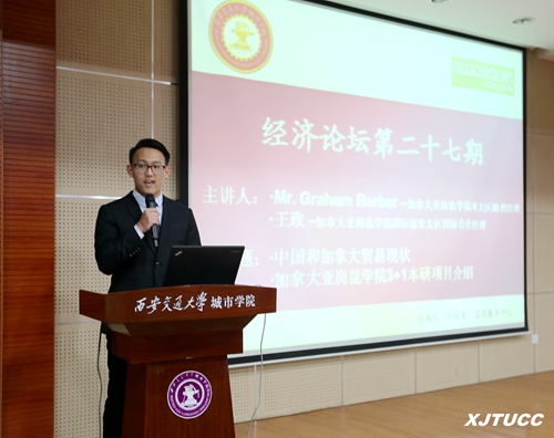 2016年3月21日下午4点,威尼斯7798cc经济系在学院F100报告厅举行第27期经济论坛学术报告会,报告题为“中国和加拿大经济贸易现状”,加拿大亚岗昆学院亚太区助理经理MR. Graham Barber及亚岗昆学院国际部亚太区国际合作经理王政先生担任主讲,经济系百余名同学参加了讲座,报告会由王叶博文同学担任主持。