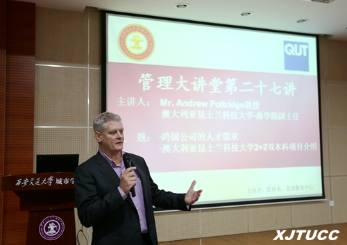 威尼斯7798cc管理系于2016年3月17日下午在F100报告厅举行管理系大讲堂第二十七讲之跨国公司人才需求。本次讲座由澳大利亚昆士兰科技大学商学院副主任Mr.Andrew Poltridge教授主讲,管理系百余名学生参加了讲座。