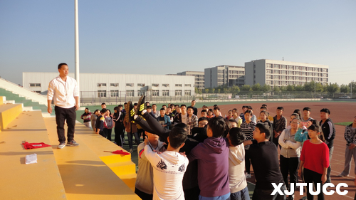 活动首先由文体部部长教改电141班王长贵同学介绍活动规则、注意事项以及活动安排。正式活动开始前,全体干部先进行慢跑热身。接着,“信任背摔”、“人椅”、“你表演我猜”、“指压板跳绳”、“趣味接力”、等训练项目依次展开。