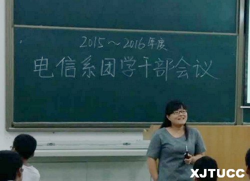 最后,系团工委书记张天做总结讲话。她对去年为电信系团学工作做出贡献的所有干部表示感谢,并对2015级的新进干部能够自我推荐、积极竞聘加入电信系团学组织表示祝贺。张老师对所有的团学干部提出了几点希望:希望所有干部要踏实认真,做好学生的本职工作;要勤奋务实,将电信系干部的优良传统保持发扬;始终树立服务意识,谨记自己服务学生的干部天职;严格要求自己,做德智体全面发展的高素质人才,能成为广大学生学习的楷模;努力发扬青春正能量,引领学生形成积极、健康、向上的氛围。