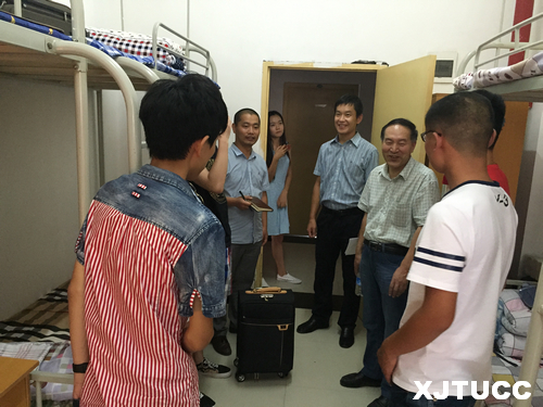 16日下午,系主任缪相林教授带领学工办全体老师走访二号、五号公寓各间新生宿舍,看望与关心2015级的新同学。每到一间宿舍,系主任都详细的问询和了解学生的基本情况,鼓励同学们尽快的适应大学新的学习和生活环境,并能以热情饱满的态度积极投入首先进行的军事训练中,历练自己,从入校开始就养成良好的学习与生活习惯,迎接大学生涯新的挑战。