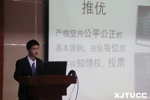 大会在激昂的中国共产主义青年团团歌中拉开序幕。首先,由院团委组织部部长曹梦泉宣读“五四红旗团支部暨十佳团支部书记”终审答辩考核标准及评分细则,并预祝各个团支部在此次答辩中能取得优异成绩。随后,来自各系的十五支团支部运用幻灯片,从支部概况、班团发展、组织建设、思想建设、学风建设等几个方面进行展示答辩。其中,能动142 团支部通过前期宣传和积极动员,传递青春正能量,增进同学们对党和中国梦认识;网络141团支部在组织建设上实行班级责任制度,通过学习与践行社会主义核心价值观增强班团发展;金融202团支部以主题“激情大一,澎湃青春”的活动宣传美好中国梦,呼吁大家争做梦想的践行者。各支部团支书用简洁的PPT,结合清晰、简练的语言表达充分展现出所在团支部的优秀风采,台下掌声不断。