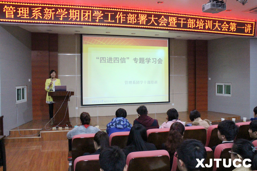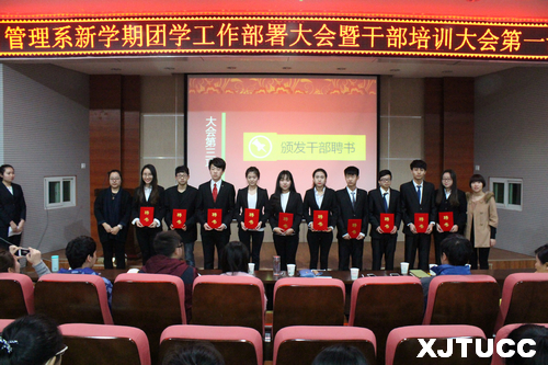 随着共青团团歌的响起,大会拉开了帷幕。首先,管理系团工委书记朱艳丽老师致辞。朱老师总结和梳理上一年度的团学工作,给予全体团学干部以肯定和认可,同时提出了2015年团学工作的任重道远。希望同学们能够继续发扬团结、奋进、积极的精神,正确处理好学习和工作的关系,抓住团学工作的平台机会,珍惜共同培养的真挚感情,继续为管理系团学奉献自己的热情。接着,各位老师为经过一学期的适用锻炼仍然坚持本职工作的副部级以上学生干部颁发了聘书,希望他们能够认真履行职责,继续发挥服务广大学生的作用。最后。管理系学生工作主管刘健老师为全体参会学生进行了以"四进·四信"为主题的干部培训报告。在报告中,刘老师特别强调了学生干部的基本任务与作用,要求学生干部发挥好"桥梁与纽带"、"闹钟"、"显微镜"与"扳手"的作用,利用好现有的平台,培养和锻炼自己的综合素质,为进入社会打好坚实的基础。