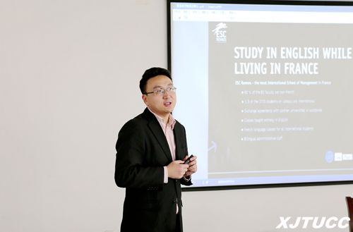 金鹏老师非常感谢同学们抽出中午宝贵的休息时间参加这次介绍会。他讲到由于法国所处欧洲地理位置优势,所以全校3800余名学生中有40%为来自全球七十多个国家和地区的国际学生,国际化多元文化和纯英文授课已经成为雷恩商学院的最大特色。此外,当讲到所有学生按照法国教育部要求在假期必须到欧洲其他国家的合作院校进行短期的冬令营或夏令营体专业实习验的内容时,同学们都惊叹到赴欧洲留学与赴北美留学相比,会有更多的机会到欧洲其他许多国家体验不一样的文化、用不同的语言学习交流、领略各种独具魅力的风光景色,认为参加两校3+1.5本硕项目从时间和费用成本来看也是一种很好的出国留学选择。