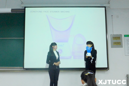 此次比赛同学们热情高涨,共有来自2012、2013、2014三个年级69位同学报名参加。比赛内容为"英文商品发布会",要求每位选手自选一种有特色的商品,以个人或小组形式,通过视频播放演示进行5分钟的全英文商品发布会。选手们在比赛中以现场展示商品、商务沟通、抽奖等形式突显自己商品的竞争优势和特色,用流利的英语介绍自己商品的卖点,个个不甘落后,表现踊跃,现场气氛热烈,获得场下同学的阵阵掌声。