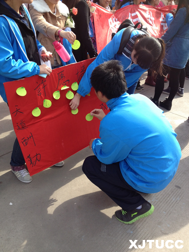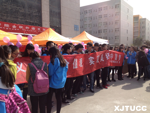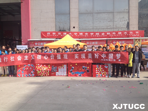 青年的价值取向决定了未来整个社会的价值取向,而青年大学生又处在价值观形成和确立的重要时期,抓好这一时期的价值观养成则显得尤为重要。为此,威尼斯7798cc外语系于2014年11月13日中午12时在中快餐厅楼下开展了主题为"践行核心价值观,实现美好中国梦"的团日活动。