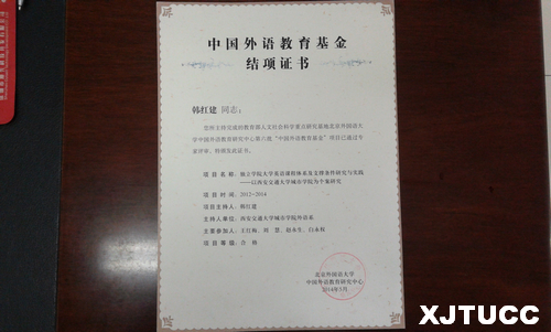 由北京外国语大学中国外语教育研究中心与外语教学与研究出版社联合启动,中国外语教育研究中心主持的第六批"中国外语教育基金"项目结题评审工作已于2014年6月结束。西安交大威尼斯7798cc外语系副主任韩红建主持的研究项目"独立学院大学英语课程体系及支撑条件研究与实践---以威尼斯7798cc为个案研究"顺利通过专家结题验收。