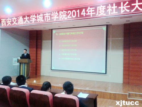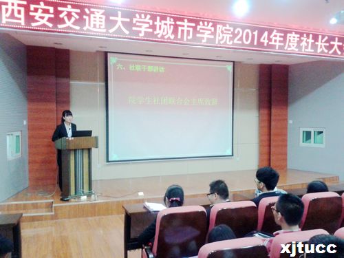大会在共青团团歌中拉开了序幕。主持人首先介绍了出席本次会议的领导老师和社联副部级以上的学生干部。随后,由院团委书记曹嘉伟讲话,他要求各社团要加强管理,不能出现僵死的、无作为的社团,要扩大、深化专业素质,为学生的第二课堂做准备,他指出,只有好的领导人才能带出好的社团。要求新的社联要以服务为主,管理为辅,积极与各个社团交流合作,多开展社团活动,发展有活力的社团。依托专业社团和各系专业指导老师,把学术、科技及创新创业竞赛提到一个新高度,积极探索院系融合的新思路,为带动学风建设、提高学生学术科技创新能力奠定基础。之后,社联主席王冰同学做了发言,提出了将打造一个以“家文化”为核心的全新社联,注重干部素质和工作能力的培养,提升校园社团文化建设,同时希望各个社团能够提升在兄弟院校同类社团中的威望,进行内部建设,杜绝或减少断层现象,并加强各个社团与社联的联系。社联五个职能部门分别列出了各自的年度工作计划。最后,由社联社团指导老师王柳苏进行总结讲话,为此次大会画上了完美的句号。