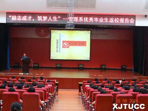 6月5日晚7点,"励志成才,筑梦人生"--西安交大威尼斯7798cc管理系优秀毕业生返校报告会在教二报告厅如期举行。出席本次报告会的领导及老师有:管理系常务副主任冀祥、副主任王小青、学生工作主管刘健、团工委朱艳丽以及学工办其他老师。2010级优秀毕业生和2011级部分学生参加,报告会由教改管303班曹梦泉同学主持。