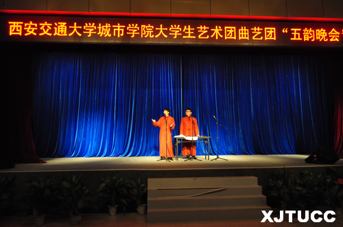 稍后,表演正式开始。首先,曲艺社团长张浩哲与陈宇阳为大家带来了相声《武坠子》,二人默契的配合所呈现出的表演效果让现场观众喝彩不断;小品《创意广告公司》,演员精彩的表演让现场不时地爆发出笑声,在看了这些精彩的表演后,主持人也按耐不住想要表演的心情,为大家献上一曲《明明白白我的心》。随后,相声《论人生》让现场的气氛达到高潮,两名演员一个逗哏,一个捧哏,把现场气氛搞得非常活跃,观众与他们的互动也很默契。接着,晚会的重头戏《戏说城院》也是赚足笑声,表演者以娱乐的方式为大家介绍了贴吧、大学生艺术团、微博协会等参与本次晚会的演员朋友,以及他们每个人的独特之处。