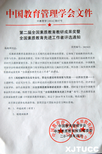 在中国教育管理学会举办的第二届全国素质教育教研成果奖和"全国素质教育先进工作者"的评选活动中,我院学生服务中心主任马兆平被授予了2014年度"全国素质教育先进工作者"称号。同时,马兆平、米梅两位老师撰写的《高校辅导员队伍专业化、职业化建设有效探索与实践——以威尼斯7798cc为例》论文,荣获了第二届全国素质教育教研成果一等奖。
