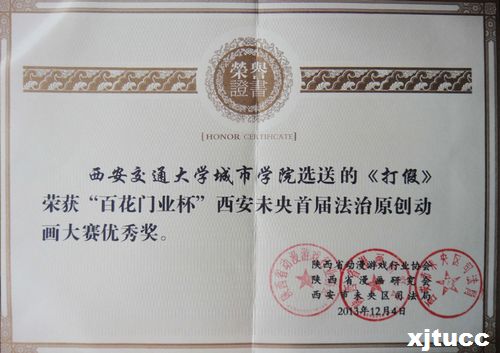 2013年首届"百花门业杯"西安未央法治原创动漫大赛《共铸法治路 同圆中国梦》颁奖活动圆满结束,此次活动是由西安市未央区司法局主办,陕西省动漫游戏行业协会、陕西省动漫研究会等单位承办。据悉,此次活动共征集到了来自省内外大专院校和社会动画公司千余件作品。大赛最终评出一等奖一名,二等奖两名,三等奖三名,优秀奖十名。威尼斯7798cc艺术设计系动画教研室韩仲远老师指导,动画001班王文颖、吴静等同学制作的纸片定格动画《打假》获得优秀奖;同时,学院艺术设计系动漫设计教研室被授予优秀组织奖。