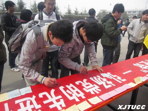 活动伊始,十幅印有陕西省党内先进事迹人物的海报让老师、同学们驻足观看。这些人物有的在工作单位担任党内职务,有的在平凡的工作岗位上默默奉献,但他们都有一个共同点,那便是忠于人民、拥护党组织,在各自的领域中为广大人民群众尽自己的一份力。同时,支部成员还以小书签的形式向同学们介绍一些党史党章小知识,使他们能够更深入地了解党,感受到党的积极性与先进性。深受优秀党员先进事迹影响的同学们,纷纷在横幅上签字,积极展现出一颗愿意向党组织靠拢的心。