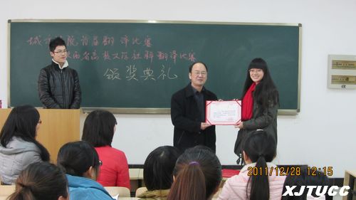为了启发学生的翻译意识,激发翻译兴趣,挖掘翻译潜力,外语系于2011年11月至12月针对全院举行了城院首届翻译比赛暨“首届陕西省在校大学生社科翻译竞赛”选拔赛。12月28日在B316教室举行了此次比赛的颁奖仪式。