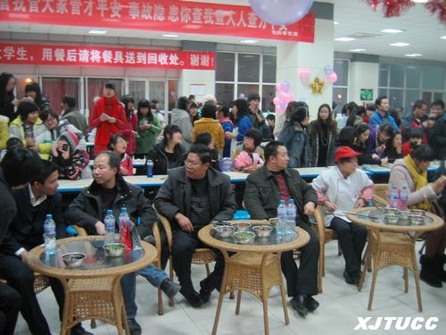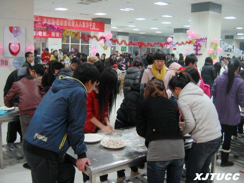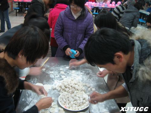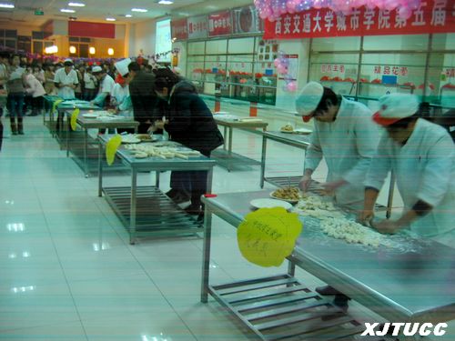 活动一开始,首先由各食堂选派2名师傅为选手进行现场示范表演,随后九十个参赛队逐个登场。观看比赛的同学挤满了食堂大厅,人群热情高昂,洋溢着欢声笑语。经过短短的八分钟,各式各样的饺子就随之出炉了,而且数量多、质量好、外形美观,赢得了观众的阵阵喝彩。活动中还穿插了同学们的文艺表演、饺子品赏等坏节,使本次大赛丰富多彩,热闹非凡,节日氛围浓厚。