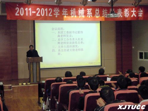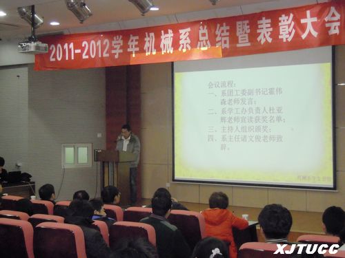 12月15日12:30,机械工程系2011-2012学年第一学期团学工作总结表彰大会在F100报告厅隆重召开。机械系主任诸文俊教授、学工办负责人杜亚辉老师、团工委副书记霍伟森老师及系全体教师和辅导员参加了此次活动。