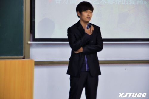 来自艺术004班的曹明明同学首先结合自己的专业方向介绍了平面设计专业的特点,通过自己在平时学习、思考到完成一副作品的经验与教训与同学们进行了分享。