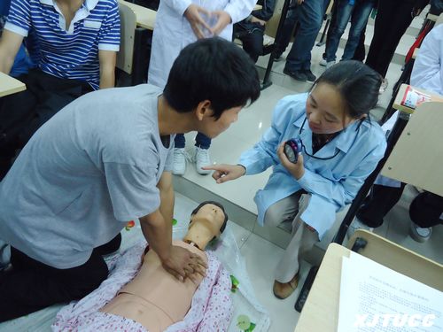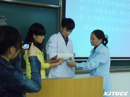 首先,王艳妮老师用人体模型给大家形象地讲述了有关心肺复苏、口对口吹气、胸外心脏按压等具体的急救方法和注意事项,并且让部分学生亲身体验了如何进行上述三种急救。接下来,王老师又给同学们讲述了关于扭伤、骨折、出血、烧伤烫伤、抽搐等多种急救方法。最后,在护理系同学的协助下,王艳妮老师借用人体模型为同学们演示了如何搬运受伤人员和骨折的固定办法。