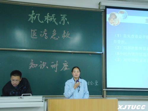 10月20日中午12:40,我院机械工程系在A100开展医疗急救知识讲座。本次讲座邀请校医务室的王艳妮老师和几名护理系学生一同为同学们讲解和演示了一些日常生活中常用的医疗急救知识。系各班的文体委员、生活委员以及部分对急救感兴趣的学生参加了此次讲座。