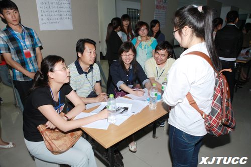 在接下来的个人面试环节中。D座大厅临时搭建的5个招聘点吸引了大量的学生关注。与会老师分别担任五家企业的面试官,全真的模拟了企业面试的全过程,投递简历、逐一面谈和应聘意见及建议反馈。精彩的提问和实战的检验,把模拟招聘会推向了高潮。